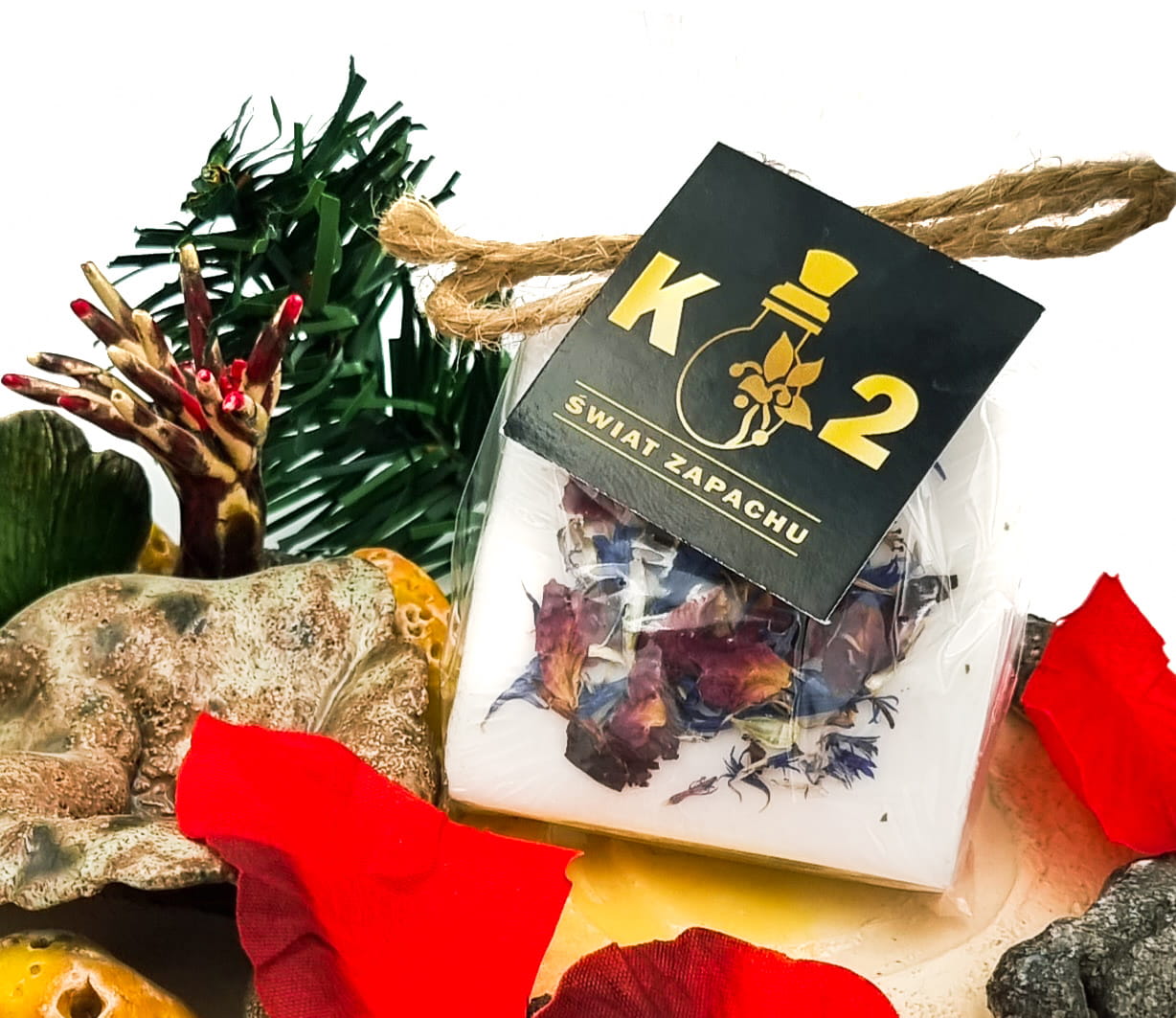 suszone płatki róży i bławatka – nadają mydłu naturalny, dekoracyjny charakter